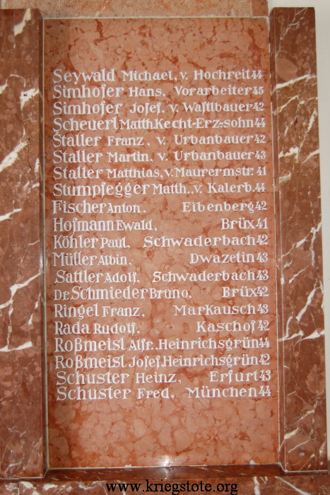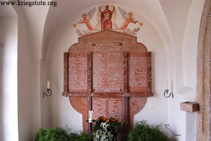 | Beschreibung: | Kriegerdenkmal in der Pfarrkirche St. Jakobus Inschrift: 1939 UNSEREN GEFALLENEN 1945 Es starben den Heldntod 1914 - 1918 |