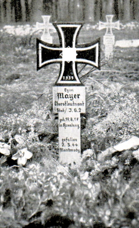Ehegatte und Vater, geboren am 19. 8. 1917, als Sohn eines badischen Bauern in Konstanz/Bodensee, wurde der spätere Schwerterträger im Verlauf des II. Weltkrieges zu einem der bekanntesten Jagdflieger. Er wuchs auf dem elterlichen "Hauserhof" auf und nutze jede freie Minute auf dem Segelfluggelände am Bellenberg bei Engen im Hegau aus. Nach dem Abitur trat er am 01.11.1937 als Offiziersanwärter in die Luftwaffe ein. Nach dem Besuch der Luftkriegsschule in Berlin-Gatow und seiner Ausbildung zum Jagdflieger, wurde er am 01.08.1939 zum Leutnant befördert und am 06.12.1939 zum Jagdgeschwader 2 "Richthofen" versetzt. Diesem bleib er, bis auf eine mehrmonatige Kommandierung als Jagdlehrer, bis zu seinem Tode treu. Im Frankreichfeldzug erzielte er seinen ersten Abschuss Er war der erste, der an der Luftfront zwischen Frankreich und England 100 Luftsiege erringen konnte, seit Dezember 1939 beim Jagdgeschwader 2 "Richthofen" im Einsatz, schoss er am 19. 8. 1942 seinen 50. Gegner ab, und im Sommer dieses Jahres hatte er 16 Abschüsse in 21 Tagen erzielt. Im November 1942 war er Kommandeur der III. Gruppe des JG 2, ab 1. 7. 1943 Kommodore, während der ab 1943 erfolgten Einflüge amerikanischer Bomberflotten waren von ihm 25 viermotorige US-Kampfflugzeuge abgeschossen worden. So gelang es ihm am 19.06.1943 innerhalb von 19 Minuten 3 "Fliegende Festungen" abzuschießen. Egon Mayer, Sieger in 102 Luftkämpfen, war am 1. 8. 1941, als Leutnant in der III. Gruppe des JG 2, mit dem R-Kreuz, ausgezeichnet worden, am 16. 4. 1943 mit dem 232. Eichenlaub, als Hauptmann und Kapitän der 7. Staffel und am 2. 3. 1944 mit den 51. Schwertern zum R-kreuz, nach 353 Feindflügen hatte der Oberstleutnant am 2. 3. 1944 im Raum Montmedy/Frankreich während eines Luftkampfes mit US-"Thunderbolt"-Jägern den Tod gefunden. Er war der Offizier in seinem verband, der am längsten im Fronteinsatz stand. Er wurde selbst 4 mal abgeschossen. Begraben wurde er auf dem Soldatenfriedhof von Beaumont le Reger und wurde dann 1955 nach St. Desir de Lisieux umgebettet |